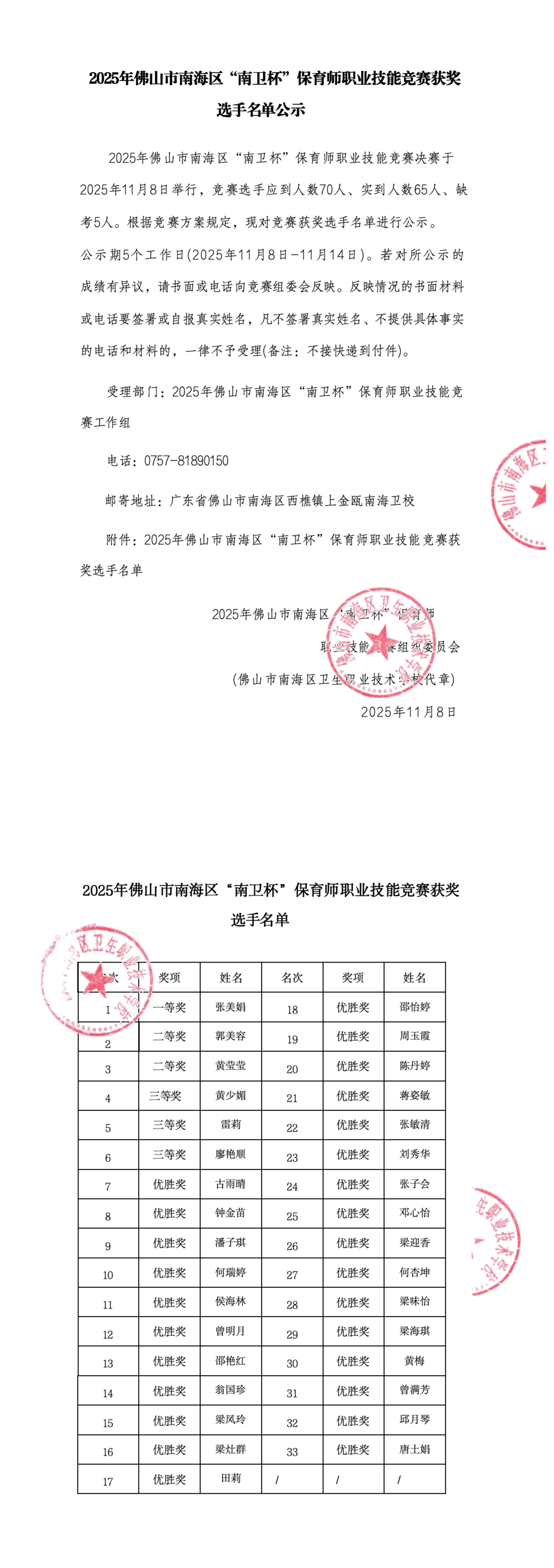 2025年佛山市南海区“南卫杯”保护师职业技能竞赛获奖选手名单公示